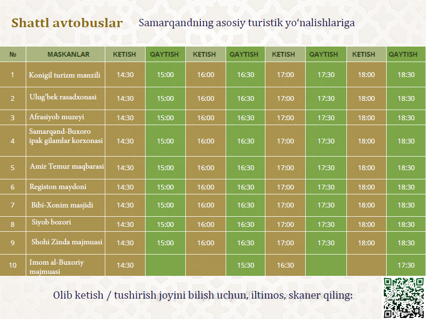 Samarqand dunyodagi eng qadimiy aholi yashaydigan shaharlaridan biri bo‘lib, YuNESKO Jahon merosi ro‘yxatiga kiritilgan. Amir Temur merosi va buyuk yodgorliklari bilan mashhur bo‘lgan bu shahar Registon maydoni, Gur-Emir maqbarasi va Shoh-i-Zinda nekropoli kabi me’moriy mo‘’jizalarga ega. Ko‘k rangli g‘ishtli minoralar va mozaikalar bilan bezatilgan madrasalar mehmonlarni san’at va fan oltin davriga olib boradi.